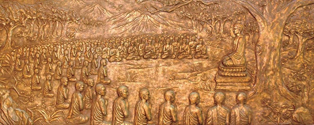 “To understand what I’m sayin/You gotta read the Sutras,/The Sutras of the Ancients, India/Long ago, when campfires at night/Across the Rahuan River/Showed lines of assembled bo’s.. “ – Hobos? Bodhisattvas? – “Showed lines of assembled bo’s/With bare feet bare the naked/Right shoulders of the passing houris/Sravasti late at night, tinkle/Goes the Indian Dancinggerl – / There’s One Thousand/Two hundred and fifty/Men/Sitting around a grove/of trees/Outsida town/right now/ With Buddha/is their leader/Discoursing in the middle,/Sitting lotus posture,/Hands to the sky,/Explaining the Dharma/in a sutra so high”
