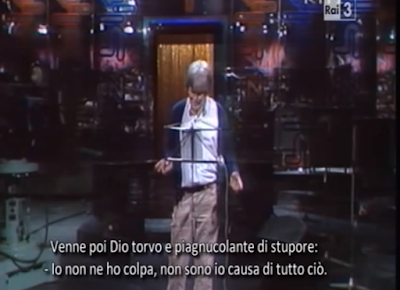 Here’s Gregory on Italian tv (appearing approximately half-way through – he’s interviewed (he speaks in English), and reads (“The Whole Mess..Almost”), appearing in a sympathetic forum, (“Blitz” – un programma innovativo“), alongside the great and much-lamented Fabrizio de Andre)