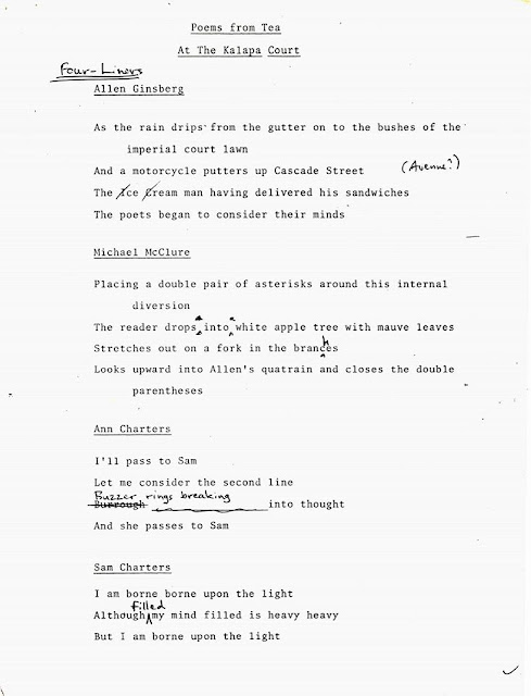 “On July 26, 1982, Chogyam Trungpa, the founder of Naropa Institute and Vajracarya (Buddhist priest), invited the artists who were present for the On the Road Jack Kerouac festival—hosted by Naropa Institute—to tea at the Drawing Room at his Kalapa Court house in Boulder, for a spontaneous poetry party. (I’m not certain they knew this before they arrived.) Later the poems were typed up by Trungpa’s students and Allen got a copy, hand-corrected it, and gave it to me to publish in Friction 2/3 – The Kerouac Conference issue. It not only includes what may be Robert Frank’s sole published poem, but also a poem directed to Ginsberg by Trungpa and Ginsberg’s reply, which I don’t believe have been published elsewhere.
