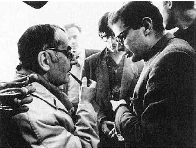 Man Ray (Emmanuel Radnitzky, 1890-1976) and Allen Ginsberg in conversation (Peter Orlovsky) there in the background. The date, we’re surmising, is, on the second of Allen’s sustained Paris visits, in 1961. The location – the cellar of the English Bookshop (42 rue de Seine, Paris) where, as Jean Jacques Lebel, organizer, co-ordinator and provocateur,points out, “we held many a bilingual reading in the ‘Fifties and ‘Sixties.”